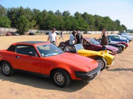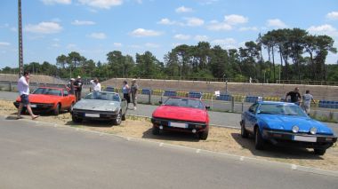 Après quelques déboires mécaniques et une insoutenable incertitude quant à sa capacité à me conduire au Mans, la TR7 ronronne, prête à partir après un plein d’essence… et un plein d’huile ! Une heure de route par un temps superbe, et nous voici arrivés à destination : le parking P12 du circuit Bugatti où s’agglutinent progressivement des véhicules tous plus apprêtés les uns que les autres alors que les essais chronométrés ont déjà débuté sur le circuit. Des MG A et B, Catheram type Seven, Lotus Elise, AC Cobra et autres R5 Turbo 2 se garent calmement, à l’exception de quelques buveurs de bière jouant du dérapage contrôlé dans le sable armés d’une Matra Murena, sous le regard réprobateur de BMistes restés entre eux, tribu oblige… Arrivent enfin les plus acharnés du site TR7.fr dont Syol, notre animateur favori en TR8 décapotée ( !), Alain et sa TR7 bleue au charme custom et Patrick au volant d’une TR7 cabriolet d’un rouge éclatant, portant ainsi à quatre le nombre de représentants de notre véhicule préféré.
