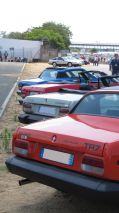 Après un casse-croûte de qualité spontanément partagé, nous regagnons nos autos pour prendre la « route » en direction des stands : la parade commence ! A vue de nez, plus de 200 voitures rutilantes sont alignées sous les gradins, prêtes à faire quatre tours de piste du Bugatti. Les quatre TR7 sont escortées par quelques Porsche, Ferrari et autres Type E, ces dernières étant nombreuses pour fêter leur cinquantenaire.